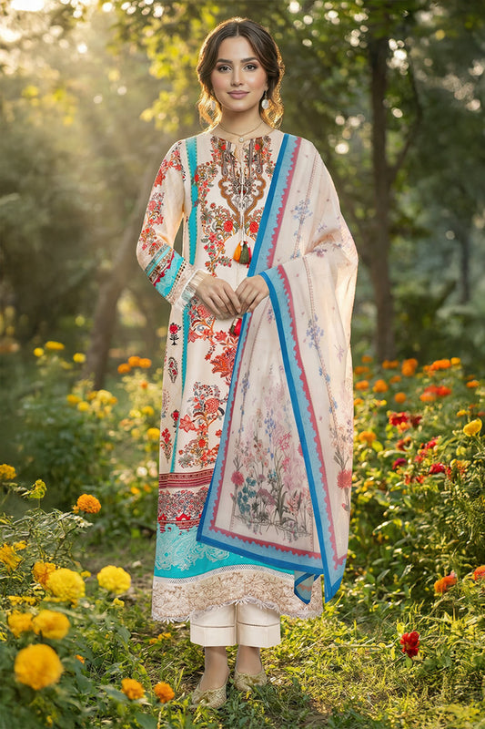 Digital Printed Cotton Satin ShirtEmbroidered Border on SleevesDigital Printed Self Jacquard DupattaPlain Cotton Satin TrouserEmbroidered...
