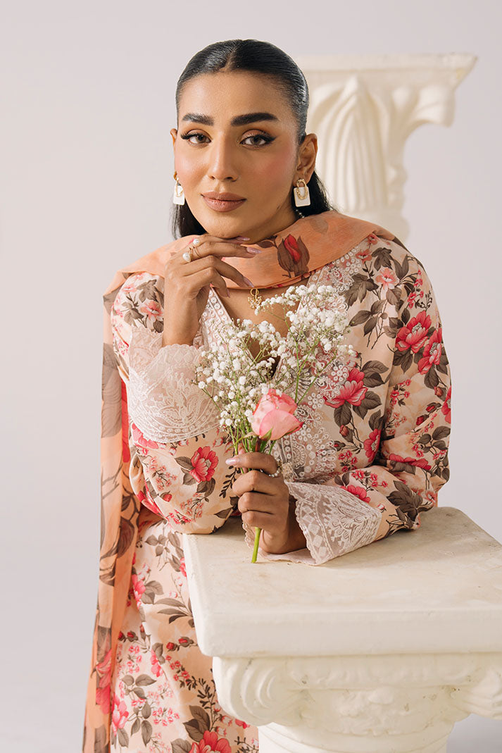 Designed with a printed lawn shirt featuring fine embroidery, this ensemble feels light and sophisticated. The printed chiffon dupatta adds softness, paired with a printed lawn trouser for balanced styling.