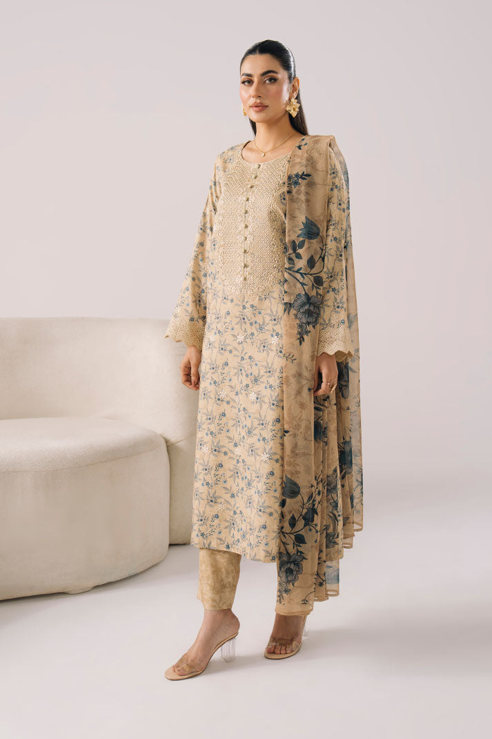 This look includes a printed lawn shirt with tasteful embroidered accents. The printed chiffon dupatta enhances its airy appeal, finished with a printed lawn trouser for all-day comfort.
