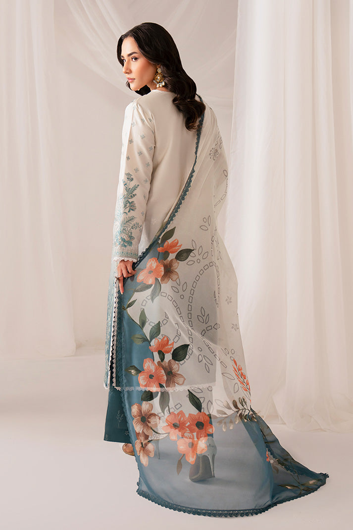 Printed cotton satin long shirt featuring fine embroidery on the neckline and sleeves, enhancing the elegant ombré design. Paired with a printed silk dupatta finished with delicate lace detailing along the edges. Completed with a printed cotton satin trouser tailored in a clean, straight silhouette.