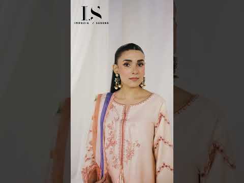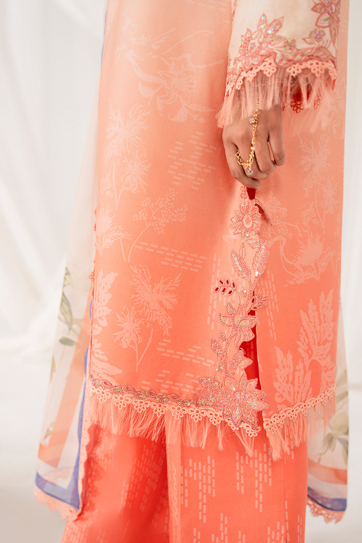Printed cotton satin shirt embellished with graceful embroidery on the neckline and sleeves, perfectly complementing the soft peach and coral tones. Paired with a printed silk floral dupatta trimmed with lace edges. Completed with a printed cotton satin plain trouser.